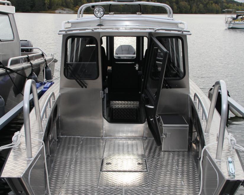 Båten för dig som behöver bekväm lastning och lossning. Med den nedfällbara fören kör du enkelt ombord en fyrhjuling eller andra redskap. Längden på fördäcket är hela 2,5 meter och klafföppningen är 1,28. Ståhöjden i hytten är 1,90. Stötdämpande Grammerstolar och god sikt gör åkturen till ett rent nöje. En perfekt aluminiumbåt för användning året runt!